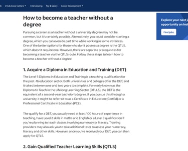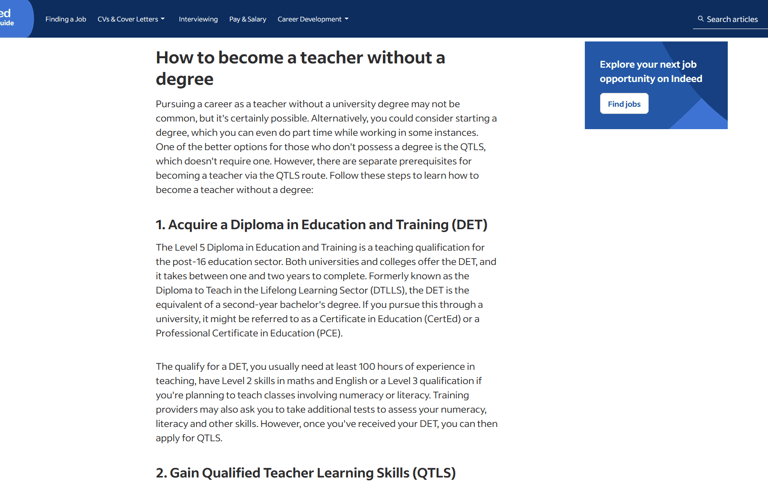Article for Indeed UK on the various steps and qualifications necessary to become a teacher without possesssing a bachelor's degree.